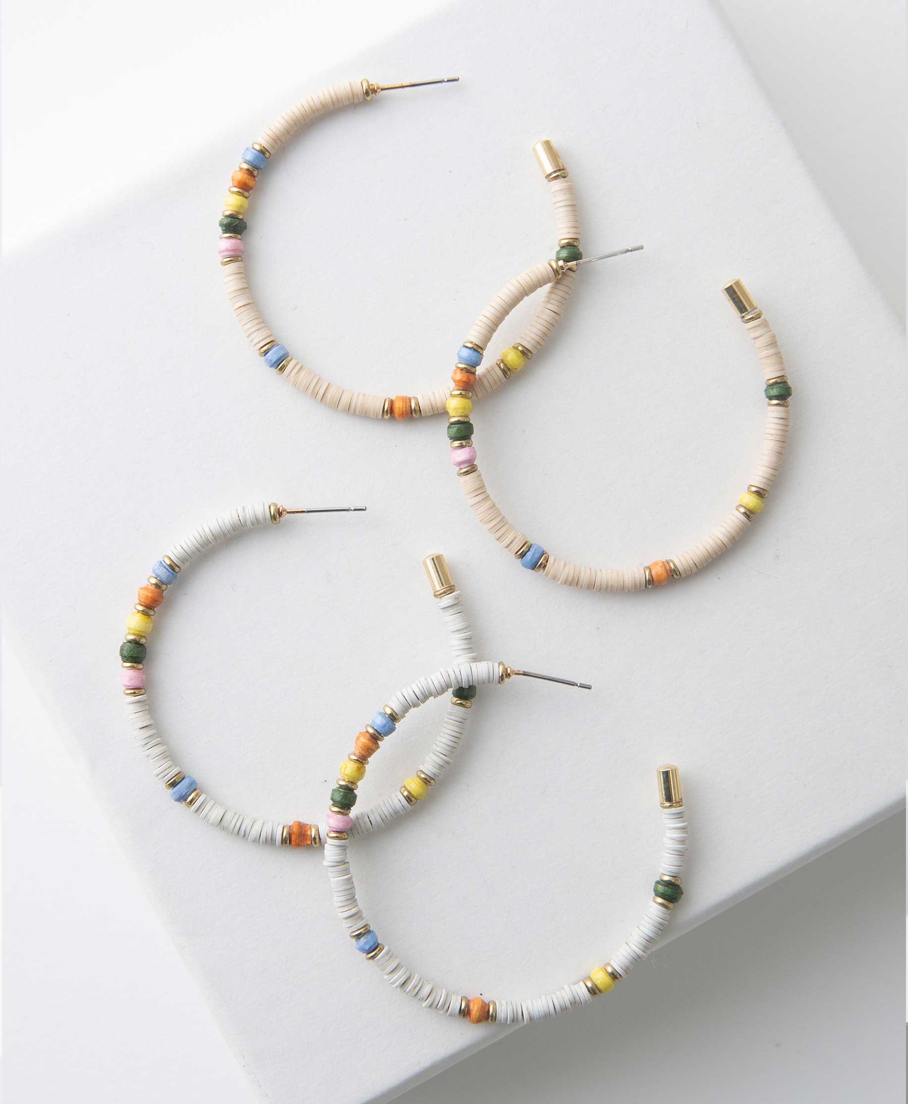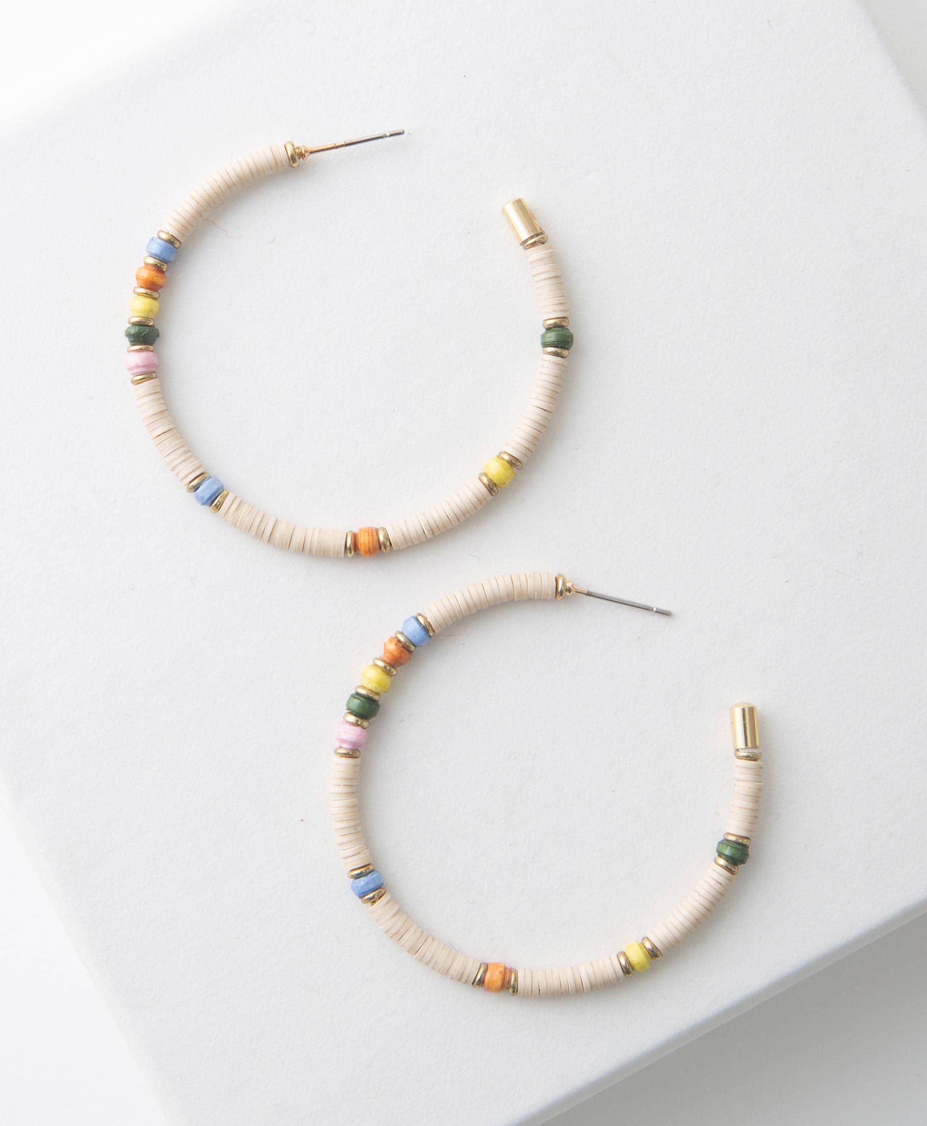 An assortment of beads in a variety of shapes, hues, and materials make these hoops a festive addition to your accessory collection. The neutral background accented with pops of color give them a look that's as versatile as it is fun. Style made with Love by Artisans in Uganda. -