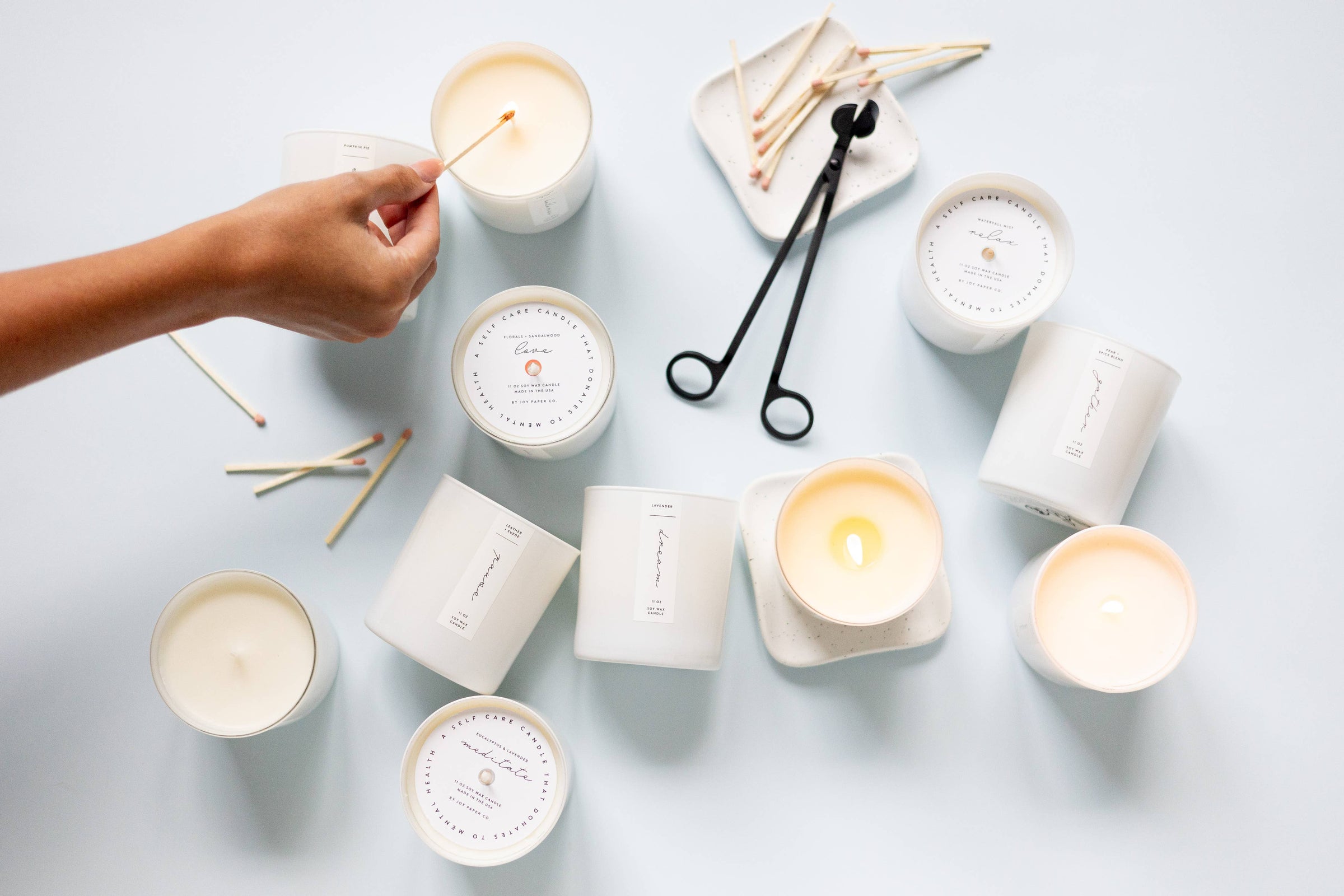 Product Info 11 oz. soy wax in white glass tumbler jar 90 hour burn time Made in the USA. Portion of proceeds support mental health research & awareness. Brand: Joy Paper Co.
